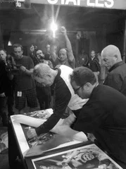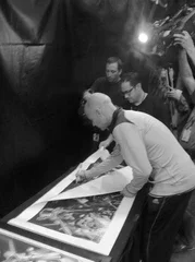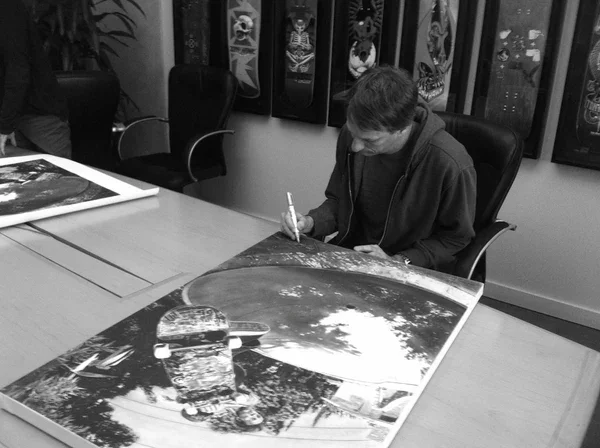 Skateboarding pioneer and alternative sports icon Tony Hawk autographs a print of artist Dave Hobrecht's piece entitled, "Tony Hawk".