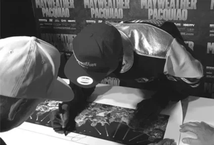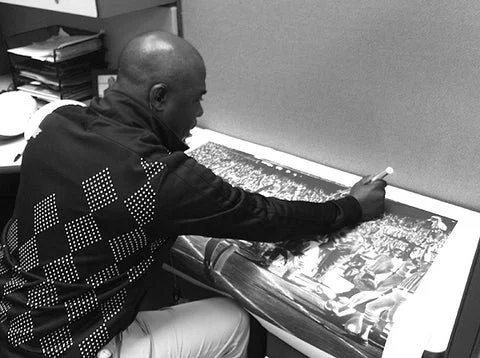 Boxing superstar Floyd Mayweather signs a print of artist Dave Hobrecht's incredible charcoal & pastel piece, "TBE Montage." Hobrecht was commissioned by Mayweather Promotions to create a large-scale custom painting for the undefeated welterweight boxing champion. The original artwork was unveiled and displayed at the MGM Grand Hotel and Casino in 2015 to ramp up the long-awaited Mayweather and Manny Pacquiao title bout on May 2nd, 2015.