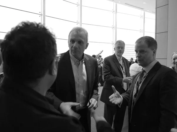 American tennis legends Pete Sampras, John McEnroe, Jim Courier, and Andre Agassi sign prints of artist Dave Hobrecht's work, "Grand Americans", featuring the four Hall-of-Famers holding up Grand Slam trophies. The original piece was autographed and auctioned for $20,000 for charity.