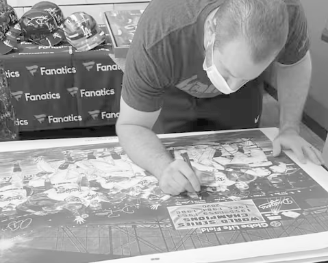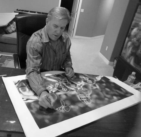 NFL legend John Elway autographs a print of artist Dave Hobrecht's original piece entitled "The Drive feat. John Elway", depicting Elway under center during the Broncos' famous 98-yard, game-tying touchdown drive against the Cleveland Browns in the 1987 AFC Championship game.