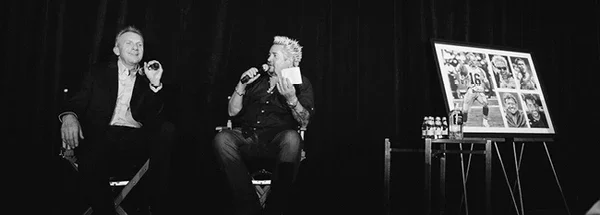 Legendary NFL signal-caller Joe Montana and chef Guy Fieri discuss the finer points of football and food beside original artwork by artist Dave Hobrecht.