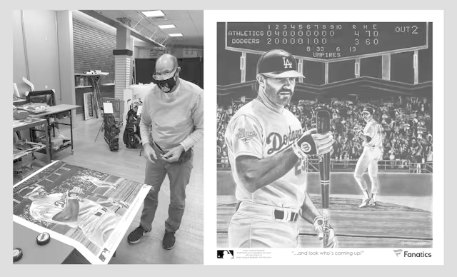 New York Yankees fan favorite and career slap-hitter Derek Jeter signs prints of artist Dave Hobrecht's charcoal & pastel work, "Legend's Call," featuring the second-best shortstop on the team giving a curtain call in front of a dugout packed with actual Yankee greats. Yeah, Jeets.