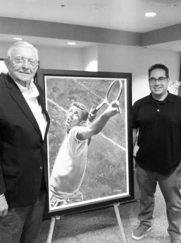American tennis great Tony Trabert and artist Dave Hobrecht pose with an original Hobrecht piece featuring the former World No. 1 in mid-serve.