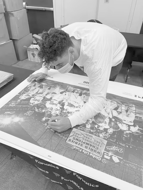 Baseball legend Willie Mays autographs a print of artist Dave Hobrecht's charcoal & pastel piece, "A'Mays'ing" feat. Willie Mays.