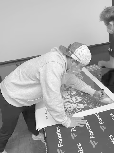 Former Minnesota Viking Linebacker Chad Greenway autographs a print of artist Dave Hobrecht's piece, "Vikes D."