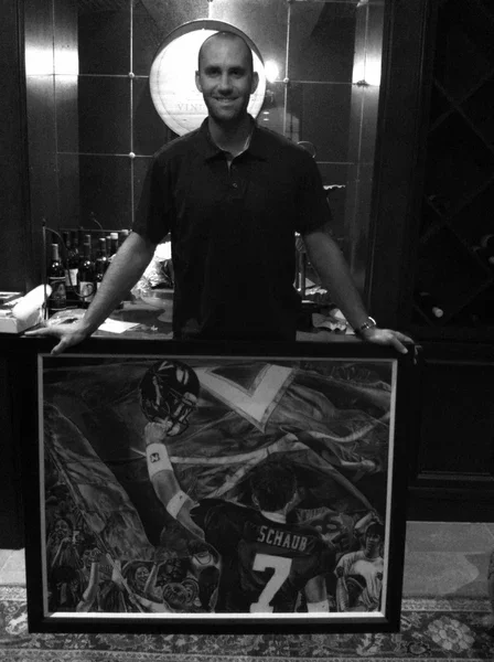 Two-time Pro Bowl quarterback Matt Schaub poses with an original charcoal & pastel piece by Dave Hobrecht, featuring #7 in his college days at the University of Virginia.